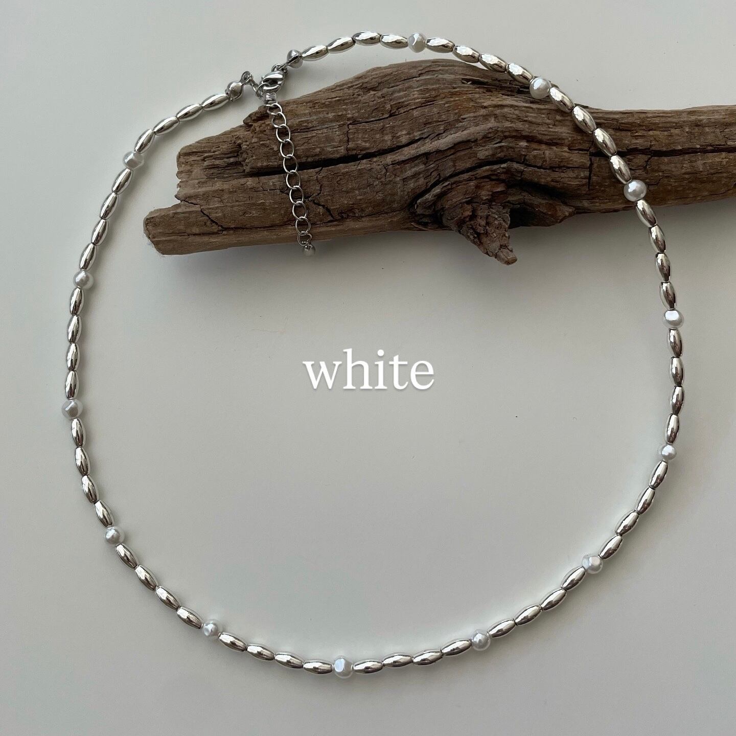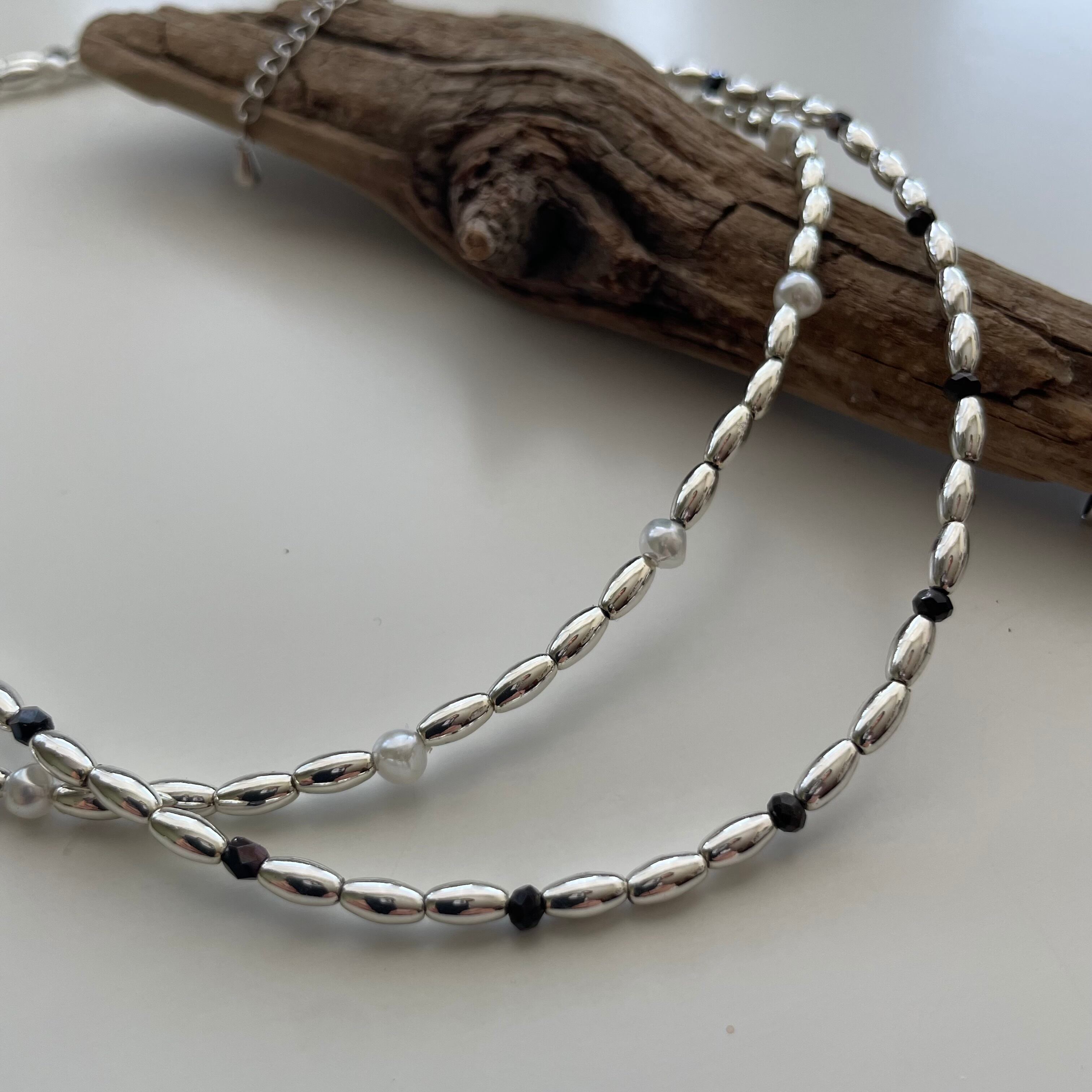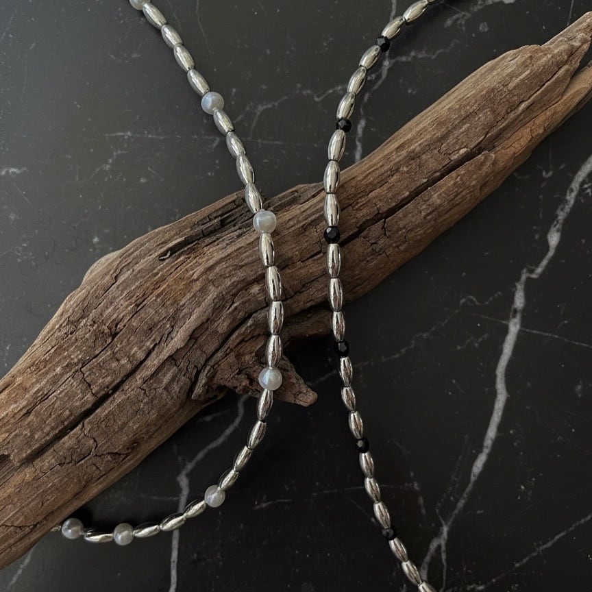 メタリックな細マッチョパールにホワイトとブラックそれぞれを挟んだブレスレット。