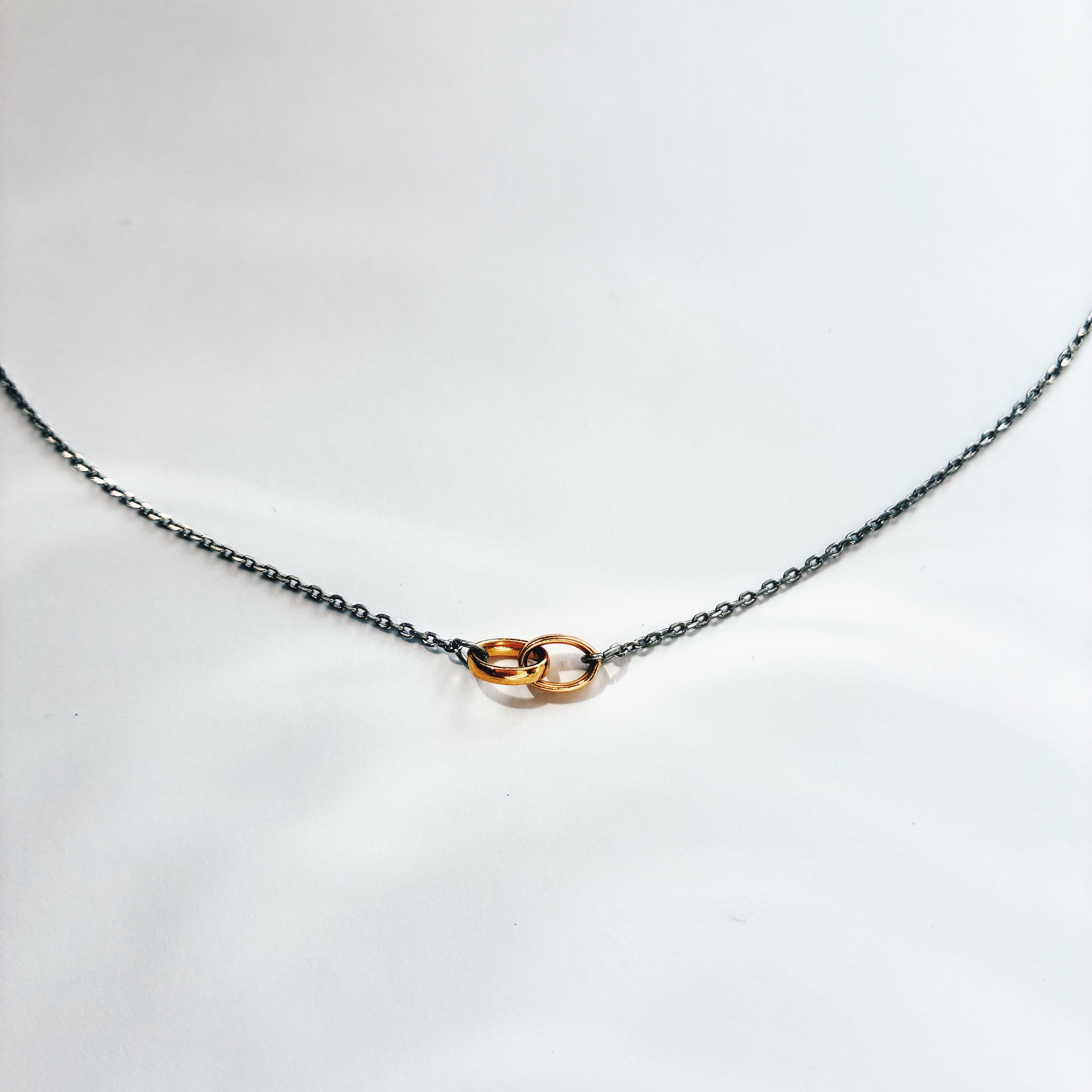 センターで重なり合う2つのゴールドリングを主役に、繊細なシルバーチェーンで潔く繋ぎ止めました。